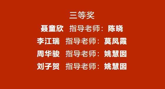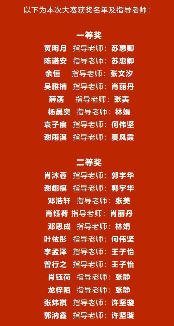 一等奖获得者包括黄明月、陈诺安、余恒等同学,肖沐蓉、谢翊祺等同学荣获二等奖,聂童欣、李江瑞等同学摘得三等奖,苏惠卿、张文汐、肖丽丹等教师获指导教师荣誉。